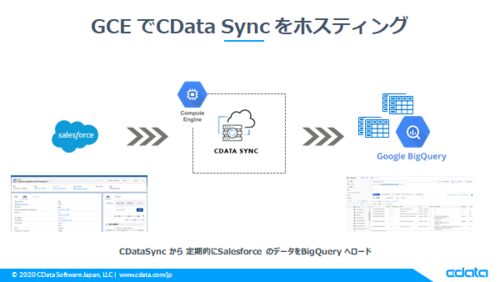 こんにちは、CDataの宮本です。 今回はGCP のCompute Engine(GCE) 上にCDataSync をホスティングさせて、Salesforce からBigQuery にレプリケートする方法についてご紹介いたします。 必要なもの GCP 上にCDataSync をホスティングする手順 GCE を作成 CData…