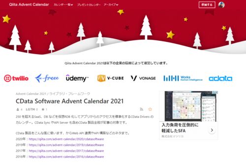 こんにちは。CData Software Japan リードエンジニアの杉本です。 気がつけばもう11月に入ってしまい、今年も残すところあと2ヶ月になってしまいました。 そして年末が近づくと今年もAdvent Calendarの季節がやってきたな!と思いますね。 今年もCData では…
